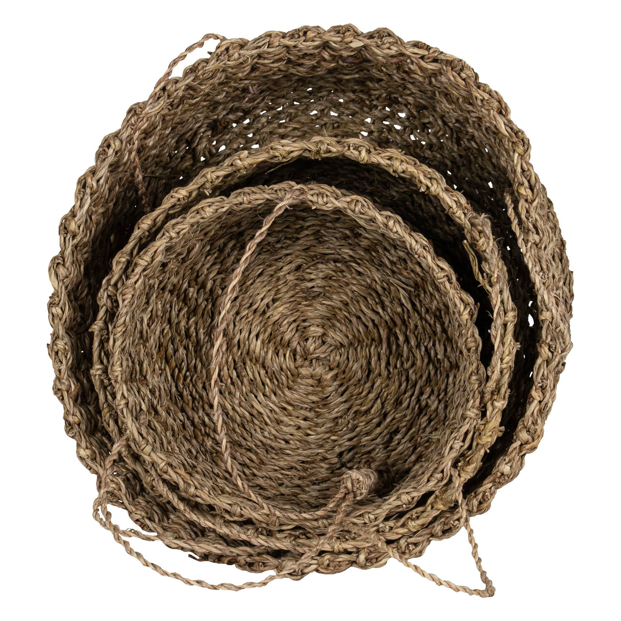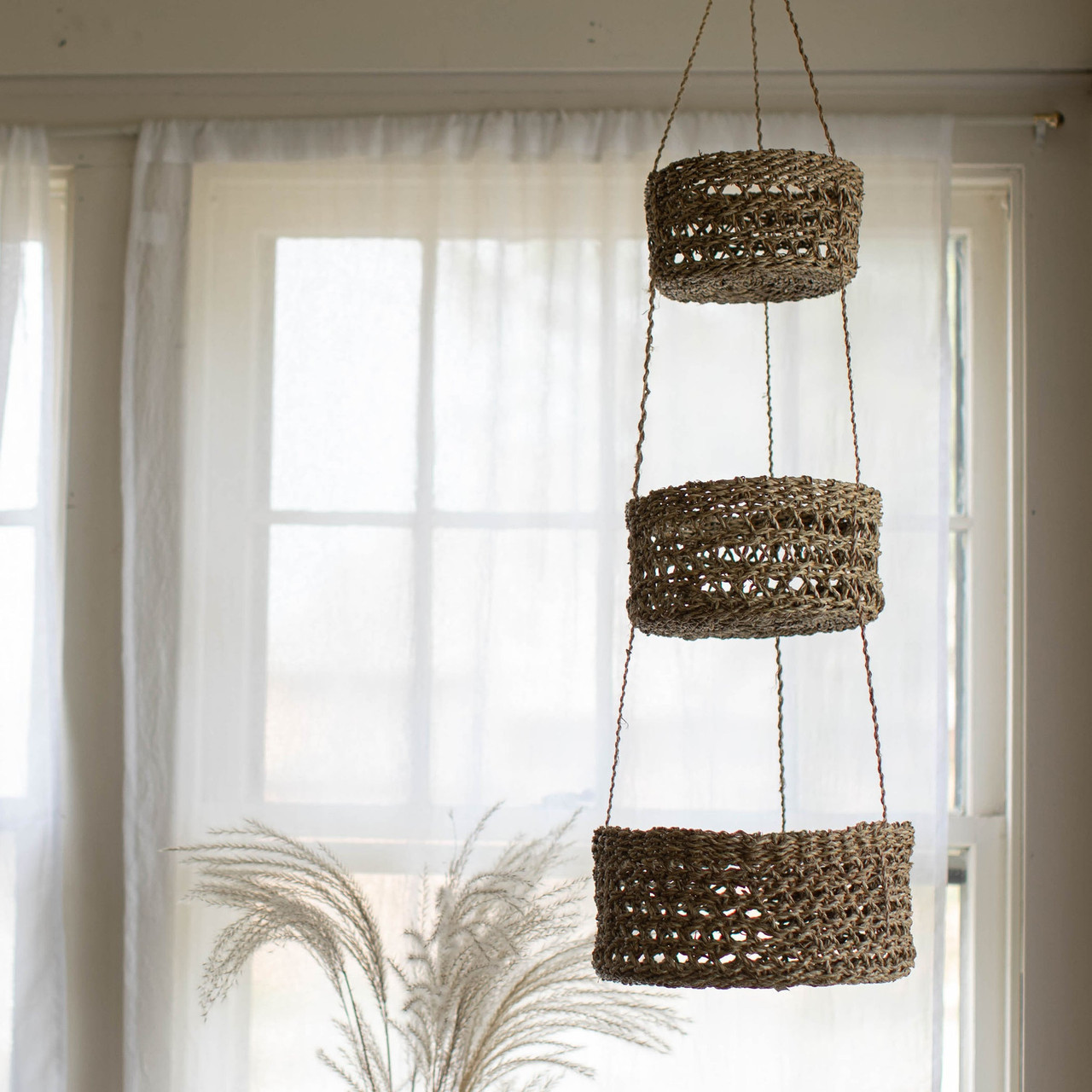 Say hello to the vintage inspired three-tiered hanging natural basket. These seagrass baskets are handwoven with an intricate pattern reminiscent of cane chairs. Woven in three different sizes, the baskets tier down from smallest to largest when hanging and can be easily nested together for compact storage when not in use. This piece would look stunning with long stemmed faux plants. Its neutral color and transitional style work in most decor settings, but pairs especially well with boho, natural, and rustic aesthetics. Seagrass is a natural material made from plants. The material is harvested and then dried for weaving.