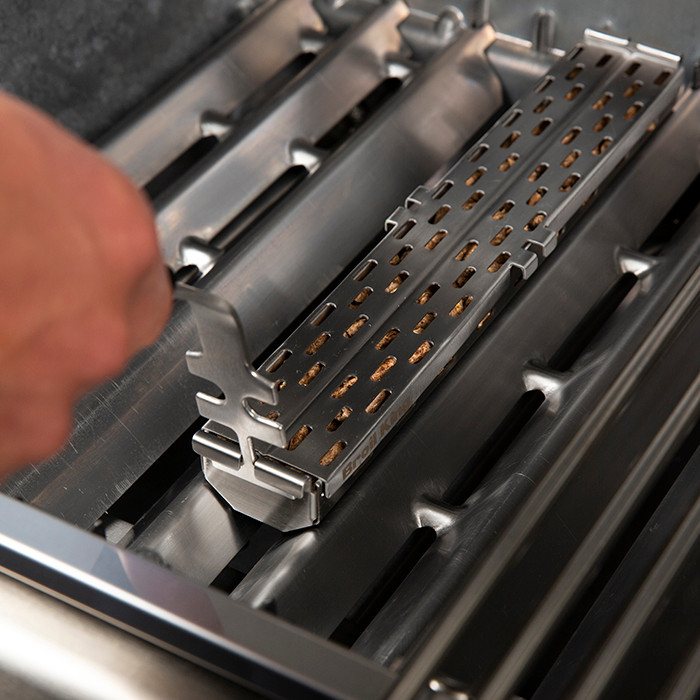 Stainless steel pellet smoker box for use with Broil King® pellets. Designed to