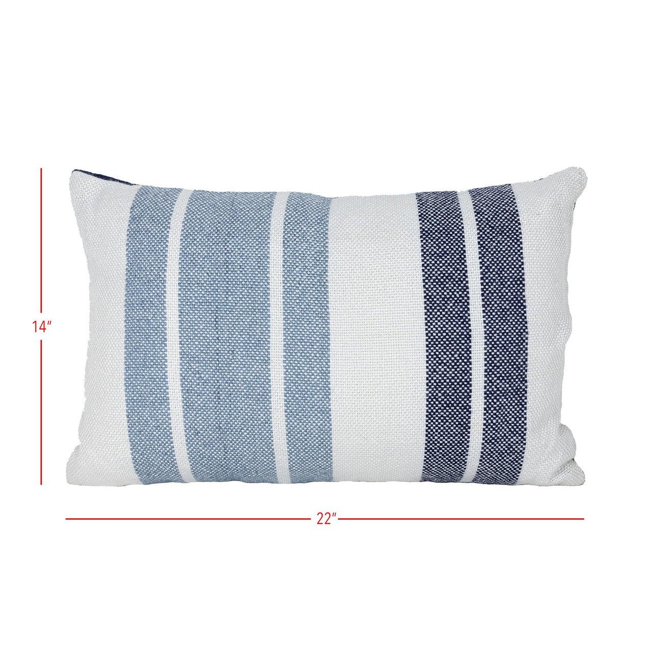 Bold stripes woven into a white base on the front and the navy pillow backing create a visual dream. This lumbar pillow is inspired by cabana style stripes in different shades of blue. The tonal stripes in varying thicknesses, paired with the simple and clean edges offer a modern take on a classic blue and white motif. Hand-woven by artisans in India and made from recycled plastic bottles, each pillow is UV stabilized making it suitable for indoor and outdoor use with a quality you can feel.