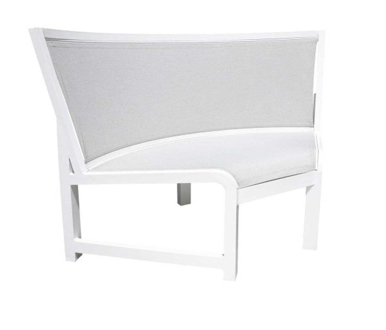 The contemporary, crisp lines of the Millcroft collection are constructed of durable cast aluminum frames which are powder coated for optimal corrosion resistance with Sunbrella Sling® fabric. Suitable for residential, commercial and poolside settings, this collection reflects our customers’ wish for luxury, function and ease. Quite unique in sling, Millcroft’s sectional furniture pieces can be configured to create a custom design with a modern twist. The Millcroft sectional collection is shown in Sunbrella Sling® Sailing Seagull on TigerDrylac® White cast aluminum frames. The Millcroft collection is also available in Sunbrella Sling® Augustine Pewter on Akzo Nobel® Black frames.
